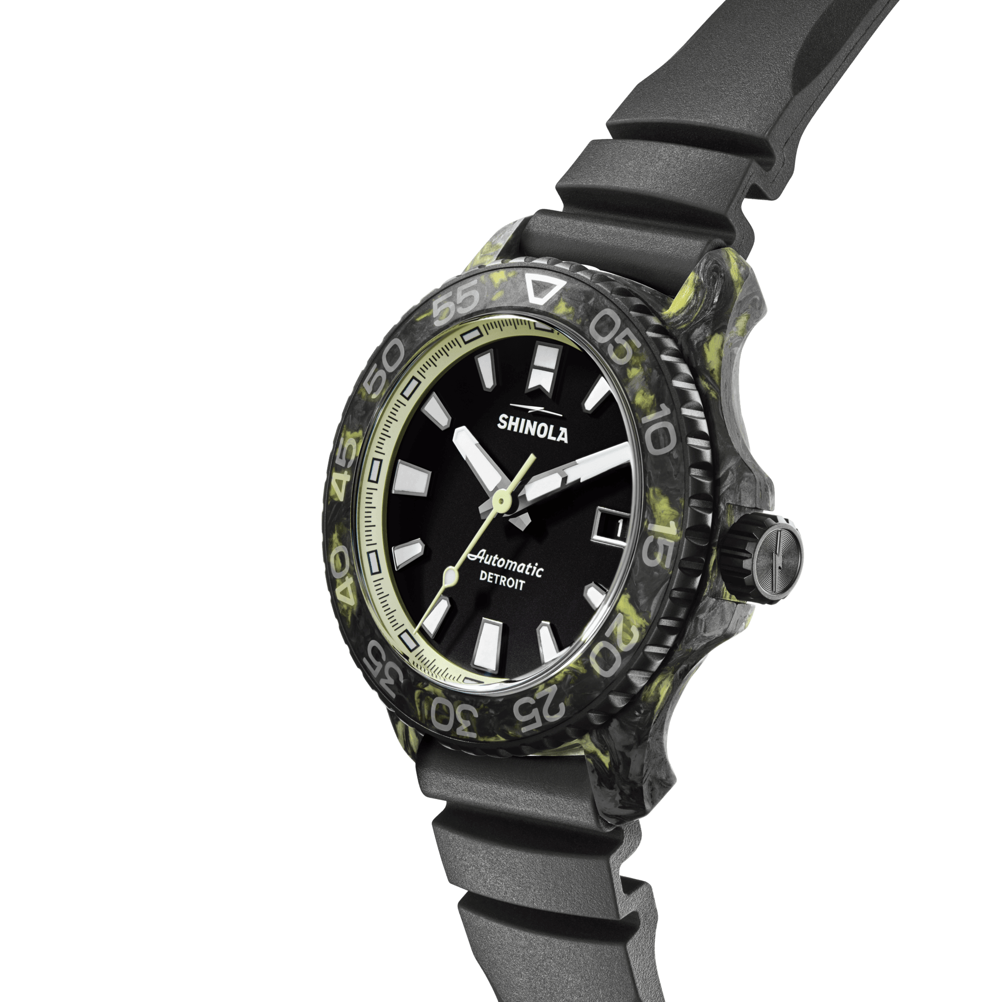 Liquidated carbon fiber, lime resin, and luminous material meld together to form a one-of-a-kind marbled case.