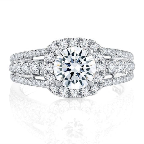 From the Metropolitan collection comes this Triple Split Shank Halo Round Cut Diamond engagement ring lavishly adorned with sparkling diamonds. A diamond halo frames the center round-cut diamond while the triple split shank shines bright with diamond pavé for a total combined weight of 0.73 carats. Made for the modern bride who appreciates opulent design, this is a lavish engagement ring that will take your breath away.