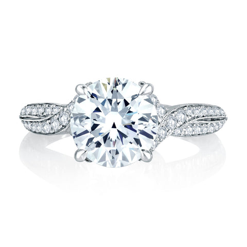 Item all about the curves on the Twisted Split Shank Micro pave Round Diamond Center Quilted engagement ring from the Seasons of Love collection. Twisting its way towards the center diamond is the split shank, which not only features Pave diamonds but is also framed with intricate milgrain detailing. The diamond Pave and milgrain detail carries through to the gallery rail while the bridge is also set with a diamond. All details are expertly crafted to embrace a love that is Forever