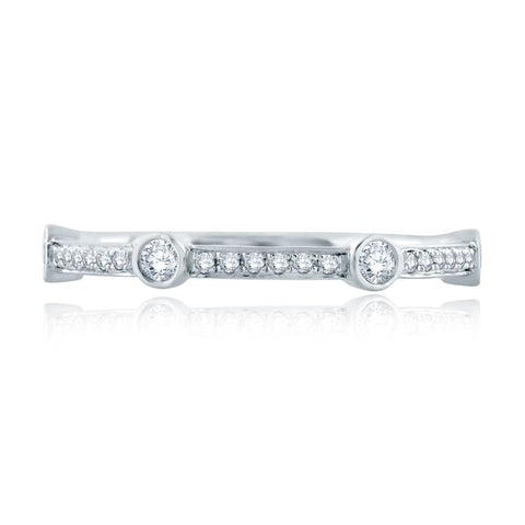 This half circle stacking band features a pave shank accented with bezel set round diamonds.