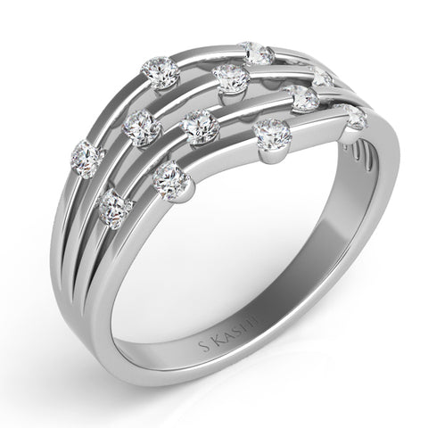 This fashion diamond ring is available in 14K White Gold. There are a total of 12 stones. There are round diamonds with a total carat weight of 0.46ct set in a Channel Set setting