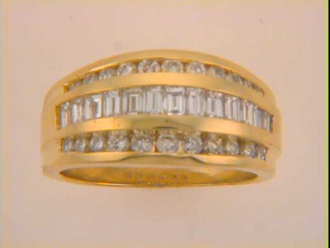 This fashion diamond ring is available in 14K Yellow Gold. There are a total of 32 stones. There are princess diamonds with a total carat weight of 1.00ct there are round diamonds with a total carat weight of 0.61ct.