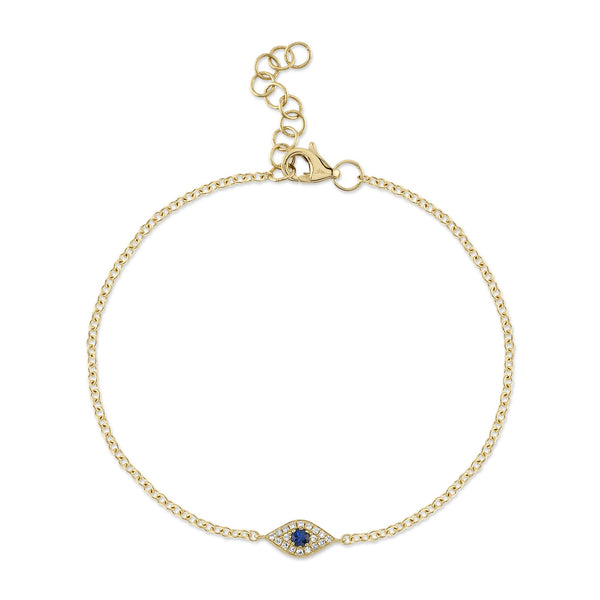 Delicate yet full of meaning, this blue sapphire and 1/20ctw diamond bracelet radiates timeless elegance and symbolic charm. Crafted in luminous 14k yellow gold, the centerpiece features a deep blue sapphire framed by a sparkling halo of round diamonds in an elegant eye motif. The refined chain is secured with a lobster clasp and includes an extender for customizable length and comfort. Sophisticated and graceful, this bracelet is a beautiful token of protection and style, perfect for layering or wearing alone as a subtle statement of luxury.