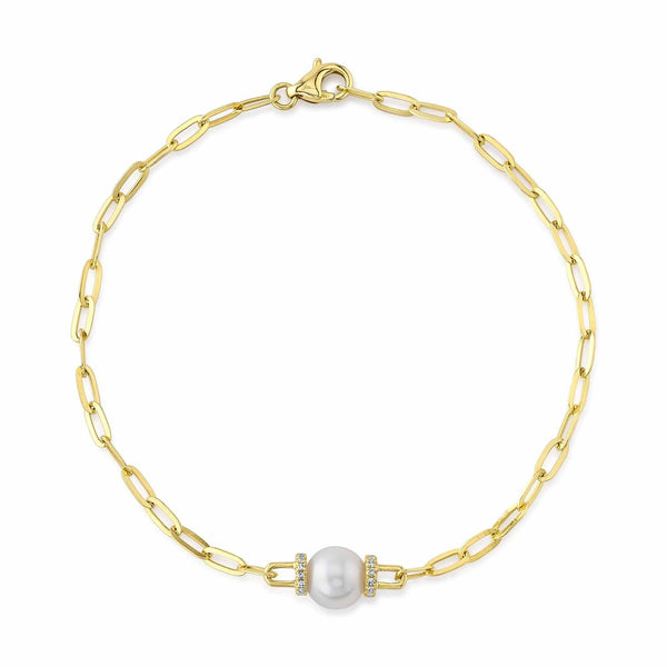 Radiating modern elegance, this 14k yellow gold paper-clip link bracelet showcases a luminous cultured pearl, framed in sparkling 1/15ctw diamond accents. The golden links create an airy, graceful silhouette, while the pearl adds a touch of timeless romance to the contemporary design. Finished with a secure lobster clasp, it’s a luxurious statement of sophistication—perfect for wearing alone or layering with your favorite pieces.