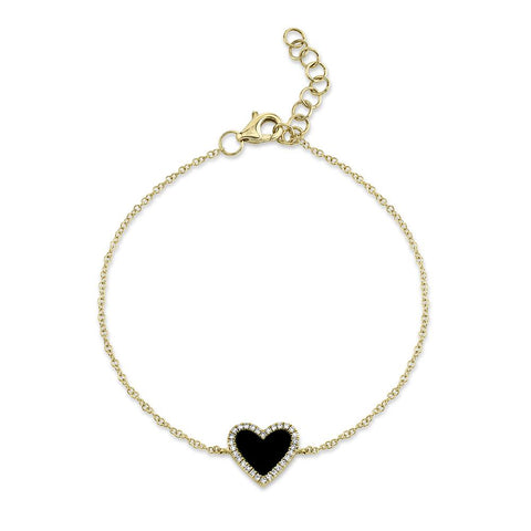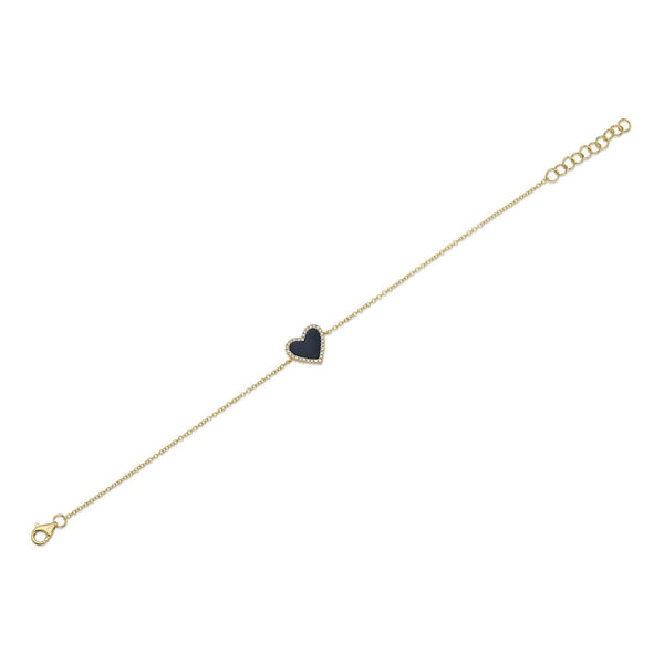 Chic and alluring, this heart bracelet features a bold black onyx centerpiece, offering a striking contrast of rich depth and sleek sophistication. A radiant halo of round diamonds totaling 1/10ctw encircles the gemstone, beautifully complemented by the warm glow of 14k yellow gold. An extender allows for customizable length adjustments, ensuring a perfect and comfortable fit. Finished with a secure lobster clasp, this bracelet adds modern elegance to any curated jewelry collection.