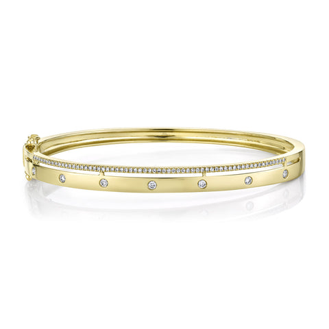 Sleek and sophisticated, this luminous bangle showcases a radiant array of round diamonds totaling 1/3ctw, adding refined sparkle along its polished silhouette. Crafted in warm 14k yellow gold, the alternating diamond pattern creates an elegant rhythm of brilliance and shine. Its slim profile offers effortless versatility, perfect for stacking or making a subtle yet luxurious statement on its own. Timeless and radiant, this bangle brings elevated elegance to every ensemble.
