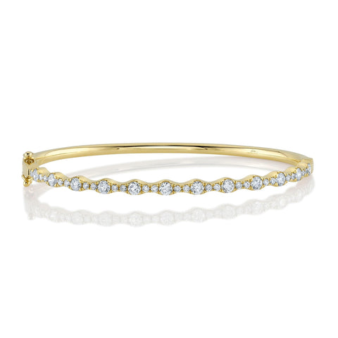 Delicate yet dazzling, this 1 1/3ctw diamond bangle captures the essence of refined elegance. Crafted in radiant 14k yellow gold, the bracelet shimmers with a continuous line of round brilliant diamonds, each gracefully set in a soft wave pattern that dances with light. Its slender silhouette and graceful design make it a timeless piece, perfect for layering or wearing as a statement of understated luxury. A modern classic, it brings effortless sophistication to every occasion.