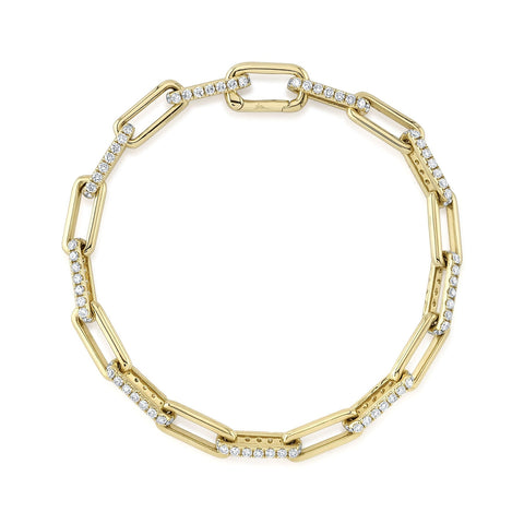 Bold, modern, and endlessly radiant, this 14k yellow gold paper clip link bracelet elevates a contemporary classic with luxurious sparkle. 2 1/4ctw diamonds illuminate every other link, creating an elegant rhythm of brilliance that dances around the wrist. The sleek geometry of the alternating design adds a chic, sculptural dimension, perfect for stacking or making a statement on its own. A refined balance of edge and elegance, this bracelet is destined to become a signature favorite.