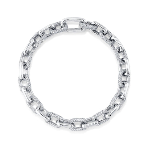 Radiating modern elegance, this 3 5/8ctw diamond bracelet transforms the iconic paper clip silhouette into a luxurious statement of brilliance. Crafted in 14k white gold, each bold link is adorned in shimmering pavé-set diamonds that catch the light with every movement. The alternating high-polish and pavé links create a captivating rhythm of sparkle and shine, resulting in a look that is both contemporary and undeniably glamorous. A striking finishing touch to any fine jewelry collection, this bracelet dazzles on its own or layered with your most loved pieces.