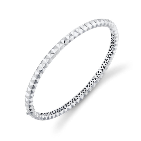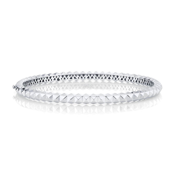The Tetra pyramid eternity bracelet creates a classy sophisticated look with 3d pyramids on both front and side walls. The 3D Tetra bracelet features the signature Michael M interior gallery and secure push clasp.