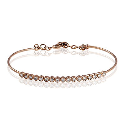 This bracelet features a slender, elegant design crafted in a rose gold tone. A row of sparkling round-cut stones adds just the right touch of shimmer, making it a perfect piece for everyday elegance or layering with other bangles.