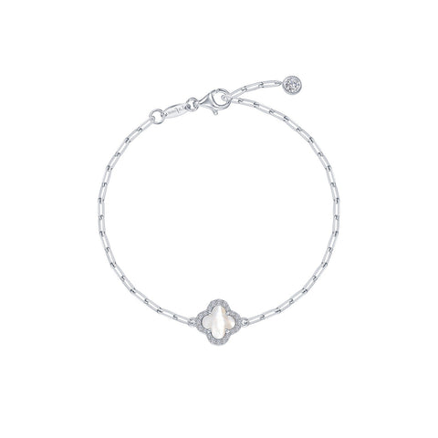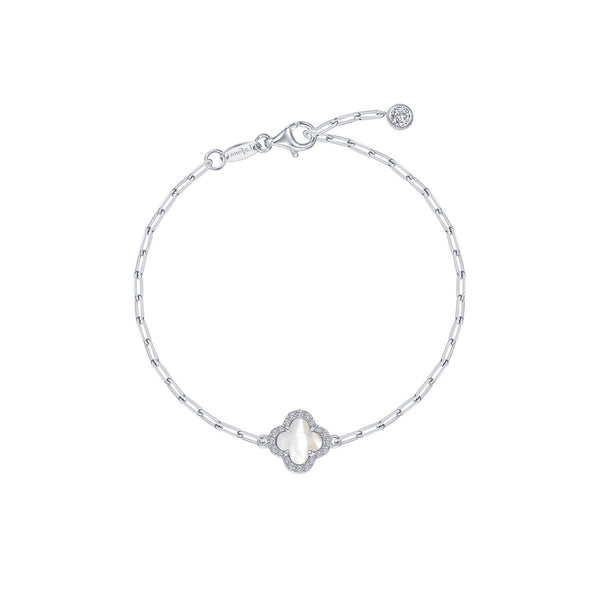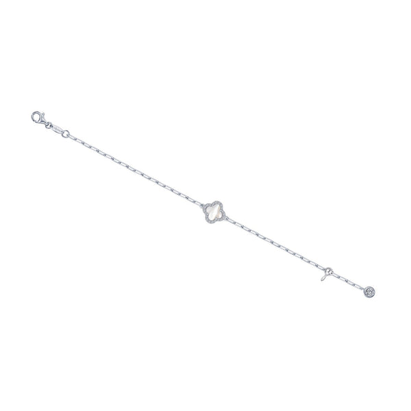 Delicate and graceful. This bracelet features a cultured freshwater mother-of-pearl clover motif on a paperclip chain. Perfect for layering or wearing solo as a subtle statement. Set with Lafonn's signature Lassaire simulated diamonds in sterling silver bonded with platinum.