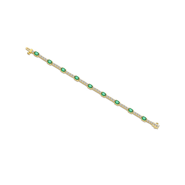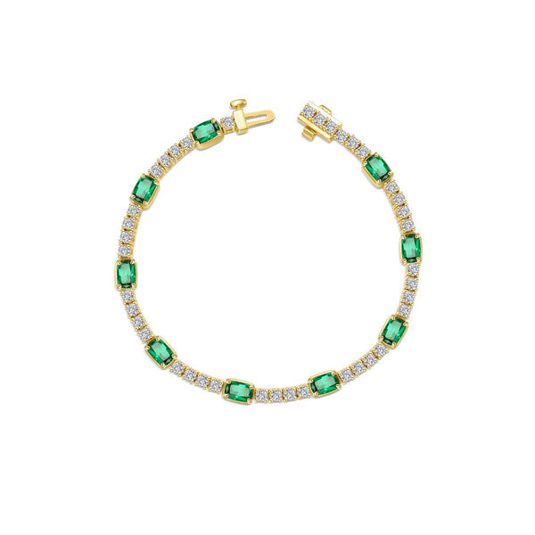 Elegant with modern flair. This bracelet features cushion-cut simulated emeralds and Lafonn’s signature Lassaire simulated diamonds, set in sterling silver plated with gold. The rich green stones contrast beautifully with the brilliant whites.