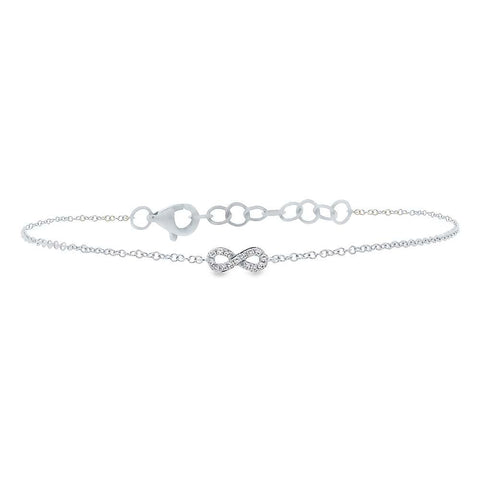 Delicate and meaningful, this 1/20ctw diamond infinity bracelet shimmers with timeless elegance in 14k white gold. The graceful infinity symbol is adorned with brilliant round diamonds, symbolizing endless love and unbreakable connection. Its slender chain and refined design make it perfect for everyday sophistication or as a heartfelt gift. A luminous reminder of forever, this bracelet captures beauty in its purest form.