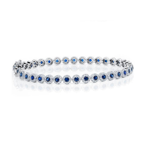 Brimming with luxurious color and sparkle, this breathtaking bracelet showcases blue sapphires encircled by 1 1/4ctw of diamonds, each stone radiating brilliance with every movement. The deep, velvety sapphires are beautifully complemented by pavé diamond halos, creating a captivating rhythm of light across the wrist. Crafted in luminous 14k white gold, this design balances timeless elegance with a bold touch of modern glamour. An unforgettable finishing piece, it adds sophistication and allure to any ensemble, from evening gowns to elevated everyday style.
