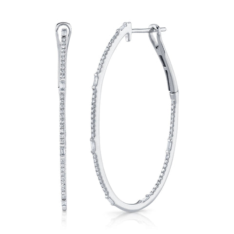 These 3/8ctw diamond oval hoop earrings shimmer with refined sophistication and modern allure. Crafted in luminous 14k white gold, each hoop features a graceful combination of round and baguette-cut diamonds, creating a captivating play of brilliance and geometry. The sleek oval silhouette flatters the face while catching the light from every angle, adding an air of effortless glamour. Elegant yet versatile, these earrings are the perfect finishing touch for both everyday elegance and evening refinement.