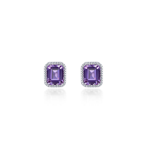 February - Amethyst. Adorn yourself with Lafonn's birthstone jewelry. These gorgeous stud earrings feature emerald-cut simulated amethysts in sterling silver bonded with platinum. A rope style border gives these splendid stud earrings a classy touch.