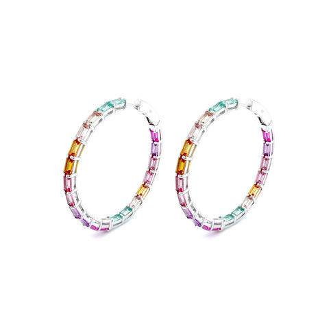 Elegant and sophisticated. These dazzling inside out hoop earrings feature sparkling multi-colored fancy lab-grown sapphires in sterling silver bonded with platinum. 45mm diameter. Lab-grown sapphires have the exact same chemical, mineral, and optical properties as natural sapphires which vary in color, texture and pattern. We make every effort to keep our lab-grown sapphire stone colors consistent. However, all lab-grown sapphires may not be exactly as shown on the website. Stones may appear lighter, darker or have natural variations.