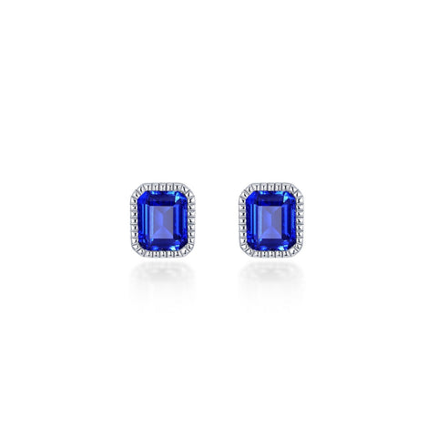 September - Sapphire. Adorn yourself with Lafonn's birthstone jewelry. These gorgeous stud earrings feature emerald-cut lab-grown saphhires in sterling silver bonded with platinum. A rope style border gives these splendid stud earrings a classy touch.