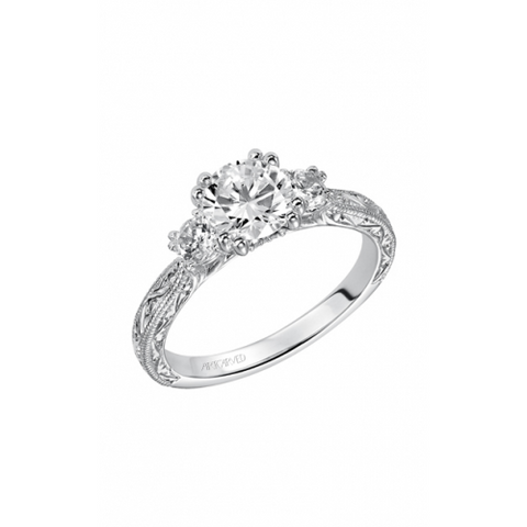 Three stone diamond engagement ring with high polished, engraved shank design with milgrain.