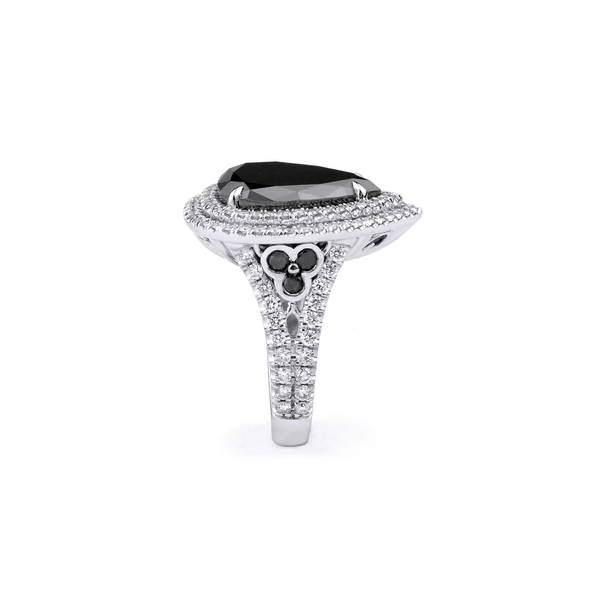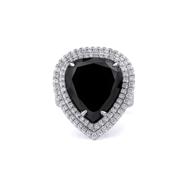 A bold expression of elegance, this exquisite ring features a striking pear-shaped black diamond, beautifully encircled by a dazzling double halo of white diamonds. Set in lustrous 18K white gold, this statement piece blends dramatic contrast with timeless sophistication.