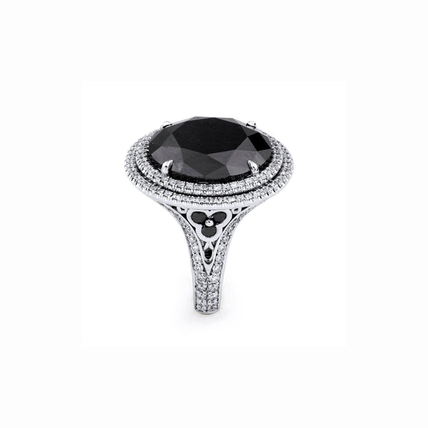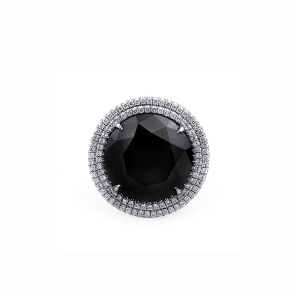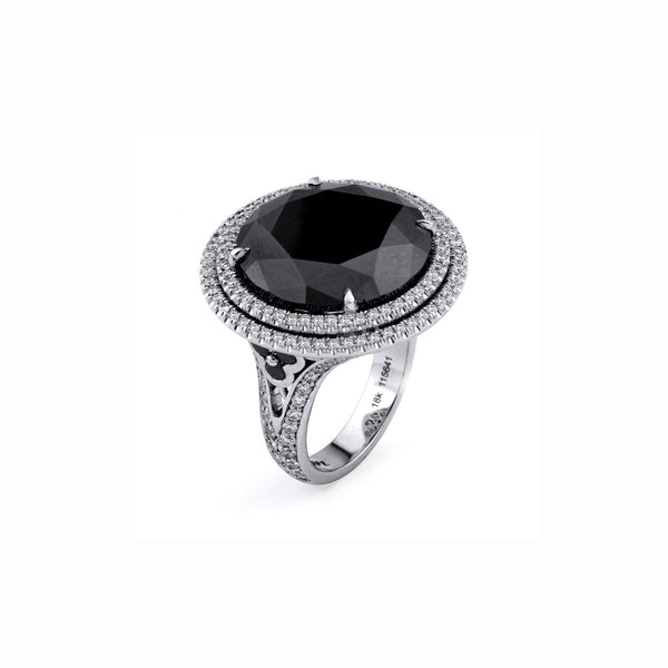 A breathtaking statement piece, this exquisite ring features a captivating round black diamond, elegantly framed by a double halo of brilliant white diamonds. Set in an intricately detailed 18K white gold band, this design embodies timeless luxury with a bold, modern edge.