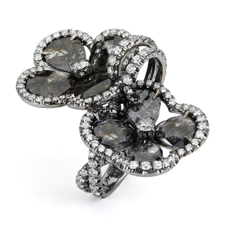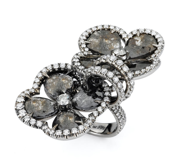 Make a bold statement with this exquisite double flower ring, a true masterpiece of artistry and craftsmanship. Designed with meticulous attention to detail, this striking piece features an assortment of natural diamonds, creating a mesmerizing interplay of texture and brilliance. Whether worn for a special occasion or to elevate an everyday look, this ring is certain to captivate.