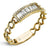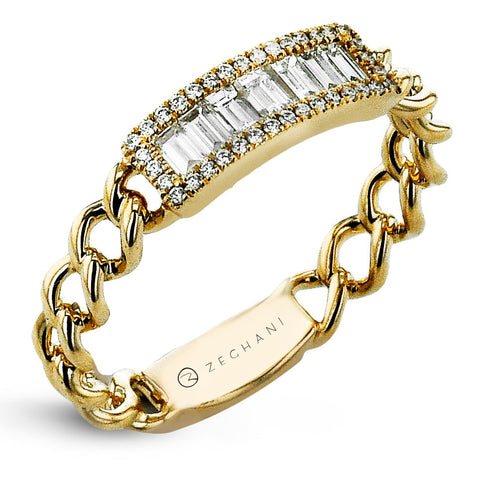 This ring combines a bold chain-link band with a rectangular top adorned with baguette-cut stones framed by a halo of smaller gems. The yellow gold finish adds warmth and contrast to the sleek, modern design.