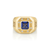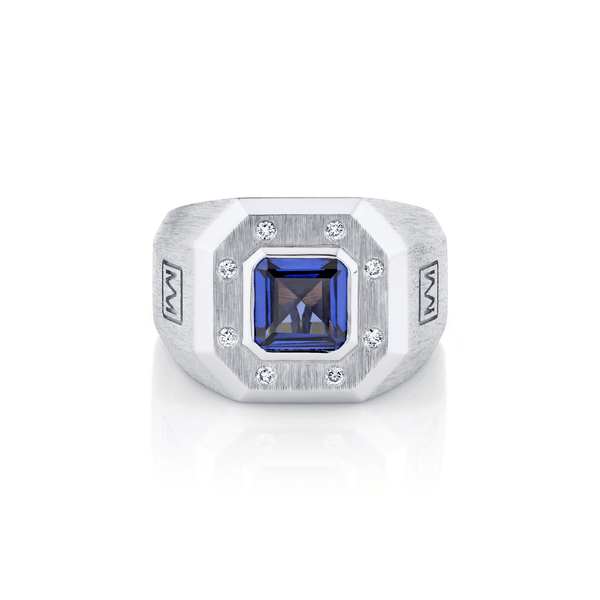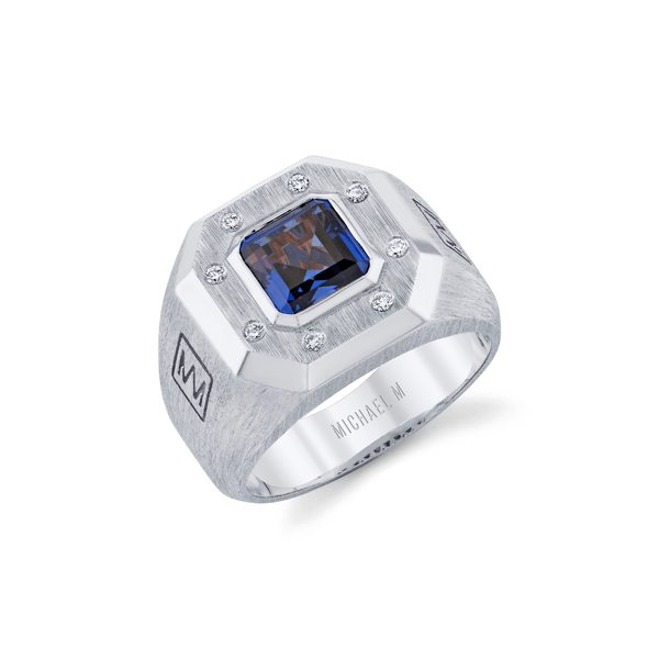 The Mens sapphire signet ring creates a bold statement with its large 8mm engineered blue sapphire cut center stone. The bezel set center stone is bordered with gypsy set diamonds and high polished beveled border. The brushed finish and octagon shape creates a sophisticated masculine look. This signet ring has strong angles, tapered band and the signature Michael M interior gallery.