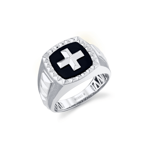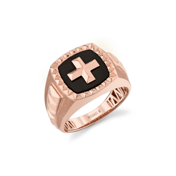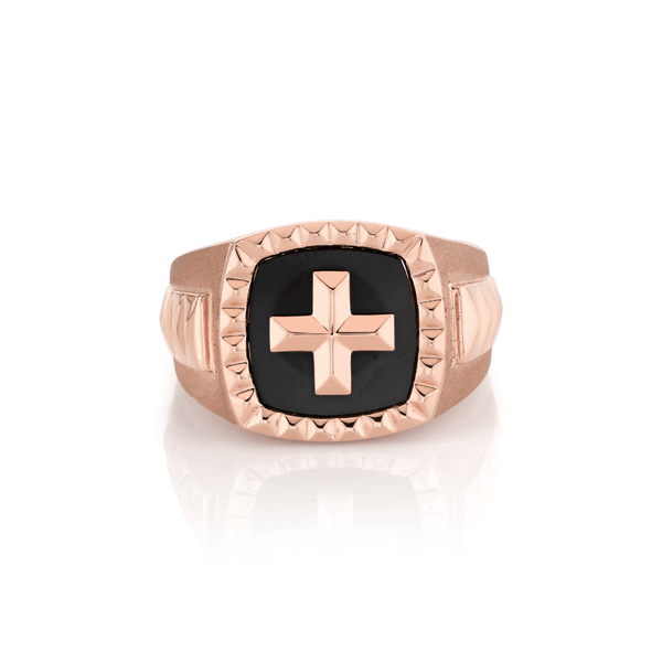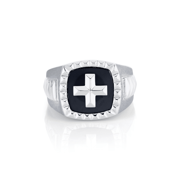 Men's Tetra Signet ring celebrates the collections modern motif of the 4 seeded pyramid. Surrounded by a pyramid border the onyx center stone displays an equal armed cross with knife edge details.