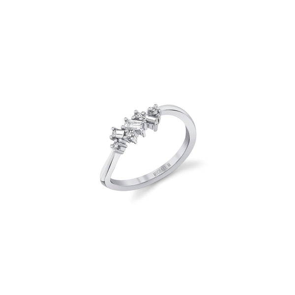 A testament to modern sophistication, the Montage Baguette Cluster Ring features baguette diamonds set at an angled position, creating a striking yet harmonious arrangement. Complementing the bold baguettes is a subtle twist in the band, while round cut diamonds surround the design, adding an extra layer of refinement.