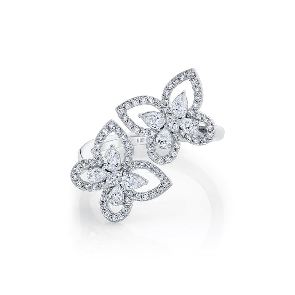 The Montage Butterfly Bypass Ring showcases exquisite craftsmanship with its marquise and pear cut butterfly center clusters, creating a delicate and dynamic focal point. Surrounding the centerpiece, a pave butterfly frame adds intricate sparkle and depth, enhancing the ring’s elegant design. This bypass style ring not only captures the graceful movement of butterflies but also offers a sophisticated, nature-inspired accessory perfect for those who appreciate fine detail and expert artistry in their jewelry collection. Ideal for special occasions or everyday elegance, it combines timeless beauty with contemporary flair.