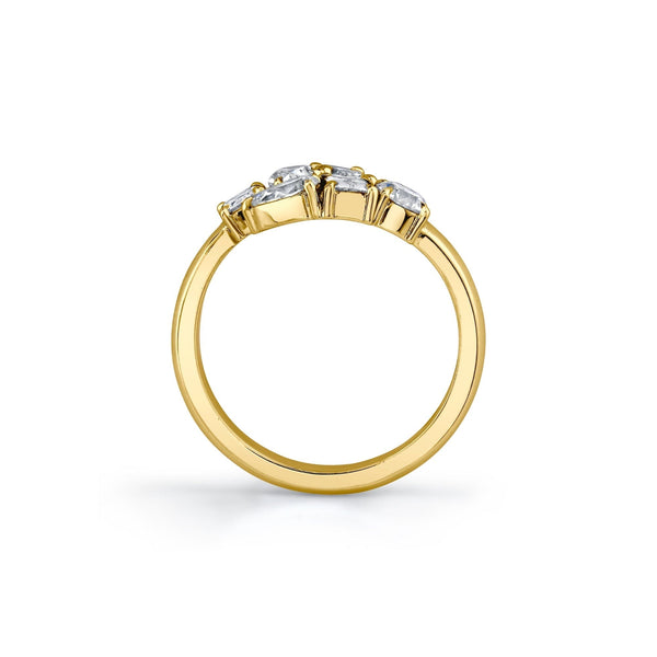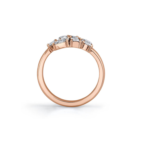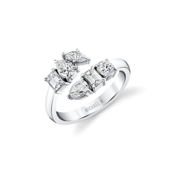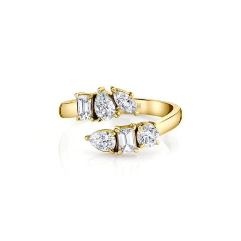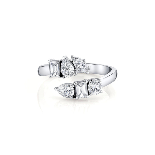 Six exquisite mixed-cut diamonds with a dazzling pave setting come together in harmony to create the Montage bypass ring. This captivating ensemble showcases the brilliance of 1 round, 1 marquise, 2 pear, and 2 emerald cut diamond. Each gem, nestled within the embrace of the bypass band, adds its own unique sparkle and character to create a truly mesmerizing ring.