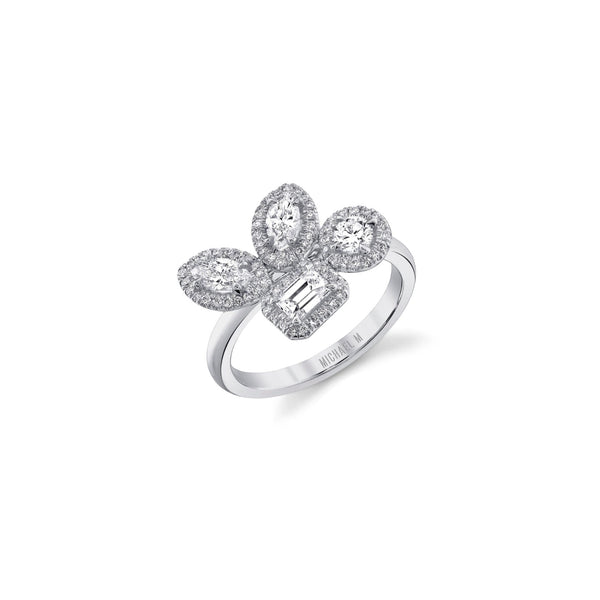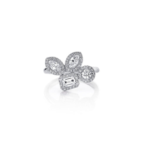Encased with a diamond halo every marquise, pear and emerald cut stone is positioned to create this Montage Cluster Halo Ring. A divine choice for a wedding day, cocktail party and instant mood booster. This ring pairs perfectly with the matching Montage Halo Cluster Earrings.