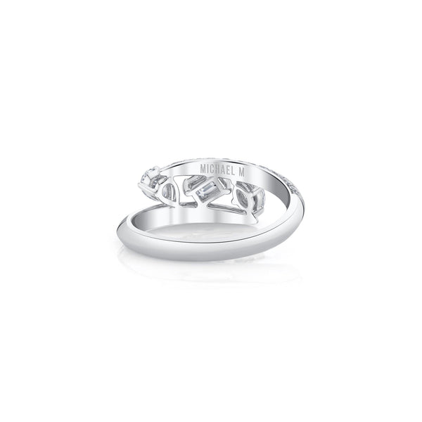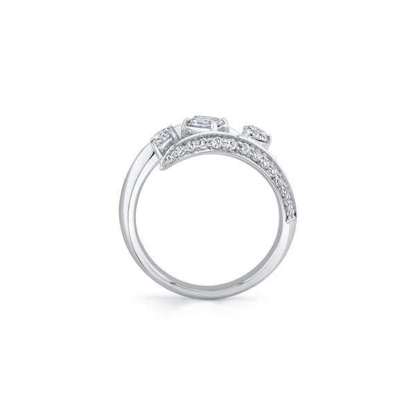 The Montage Pave Knife Edge Bypass Ring showcases 3 mixed cut diamonds, providing a captivating and distinct showcase of shine and radiance, accompanied by a pave row of diamonds at the base. With meticulous artistry and careful attention to every detail.