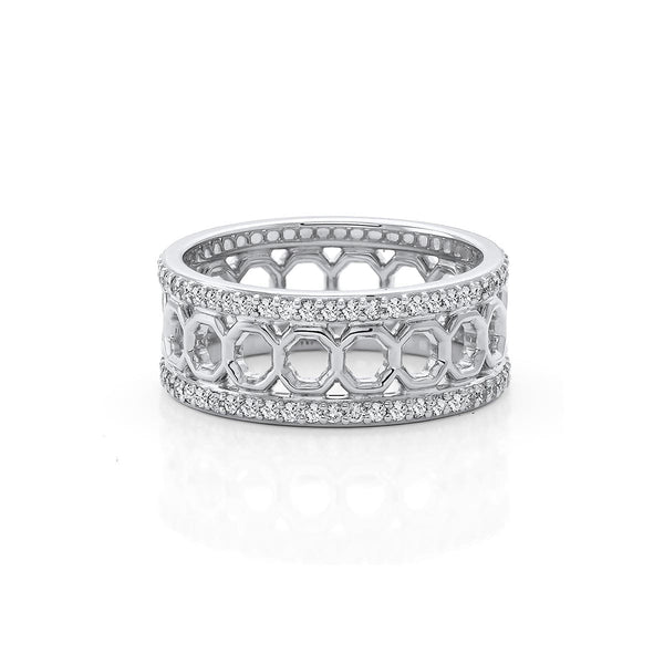 The OCTAVE wide band ring showcases a captivating motif of alternating yellow gold and white gold open octagon shapes, set between two pave bands. Strut this stunning two-tone design and enthrall your admirers with its bold, attention-grabbing style.