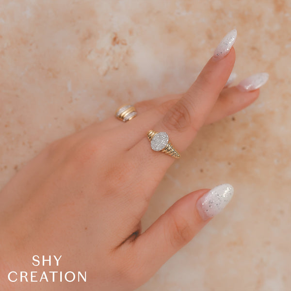 0.17CT 14K Y/G DIAMOND RIBBED PAVE OVAL SIGNET RING