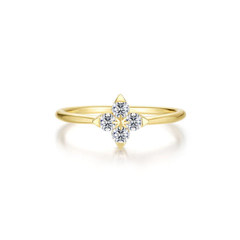 What better way to celebrate than with a hint of flora? This flower-inspired design represents the powerful energy that brings forth new life. This ring is the perfect blend of nature-inspired charm and refined luxury. Whether as a statement piece or a subtle accent, this ring brings a timeless elegance to any occasion. Set with Lafonn's signature Lassaire clear simulated diamonds in sterling silver plated with gold.