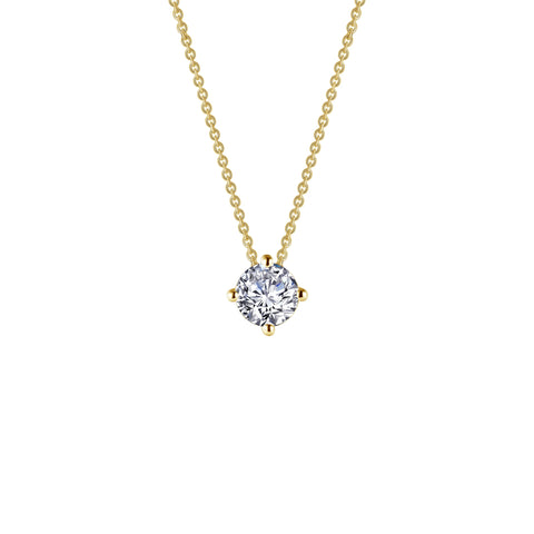 Simple yet charming. This adjustable round solitaire necklace is set with a Lafonn's signature Lassaire simulated diamond in sterling silver using Lafonn's exclusive TR Gold, a new and improved plating process that preserves the rich color of gold and enhances the wearability of our gold-plated styles. Simulated diamond is 6.5 mm in diameter.
