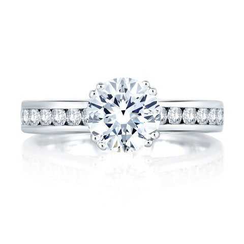 Ideal for the refined woman. The A.JAFFE Prized Possession ring is a classic cathedral engagement ring with channel set diamonds. It is a ring she surely cant live without.
