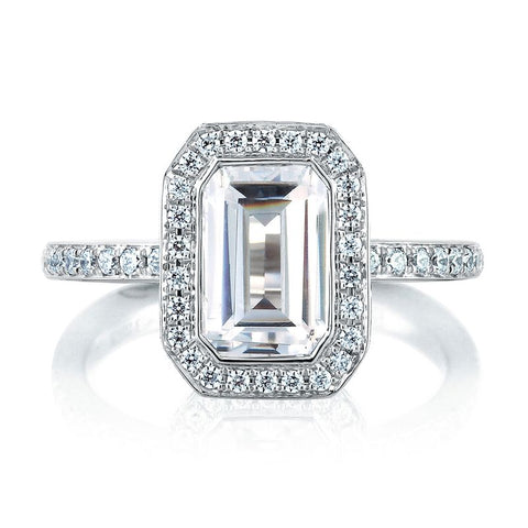 From the Metropolitain Collection, this emerald cut engagement ring features a tiered prong set halo standing out against the rest.