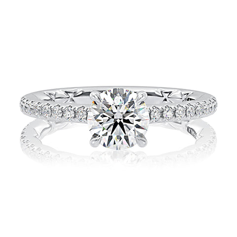 From the A.JAFFE Quilts™ Collection comes this gorgeous diamond engagement ring with a Round Center Stone. Underneath the center stone is a Hidden Halo for the extra sparkle and brilliance. The band features a true handset pave and a A.JAFFE Quilts™ Interior that will ensure the ring stays upright and centred providing a luxurious feel.