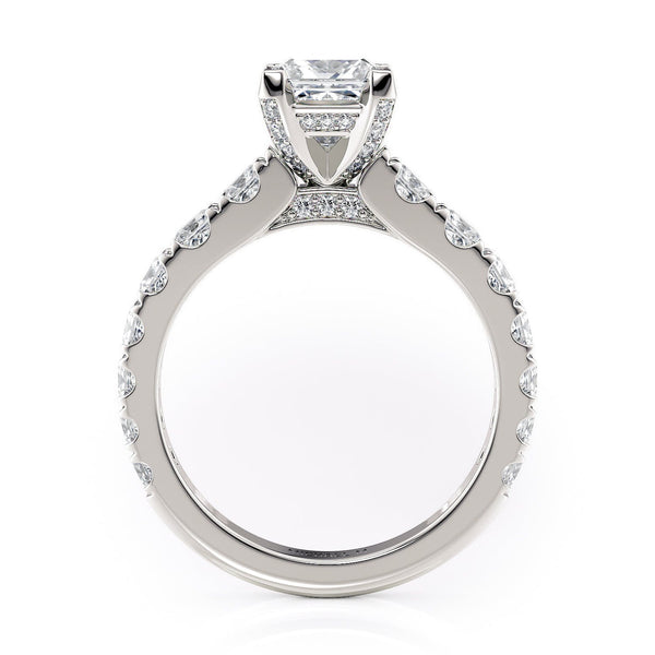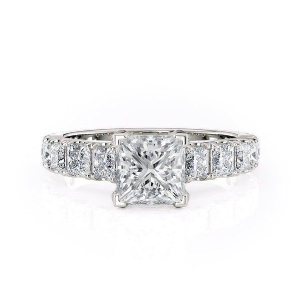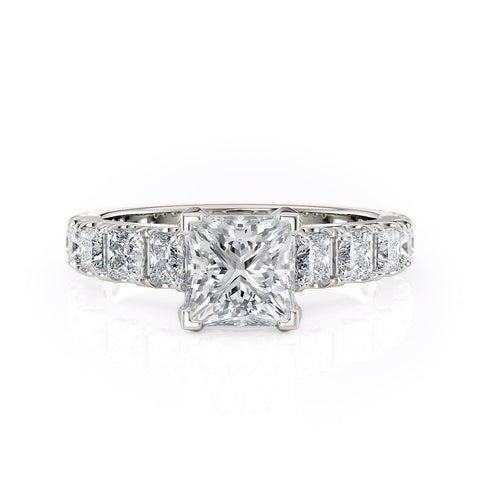 This elegant diamond engagement ring showcases a dazzling princess-cut center stone, enhanced by additional princess-cut diamonds set along the band, embodying classic elegance and refined artistry.