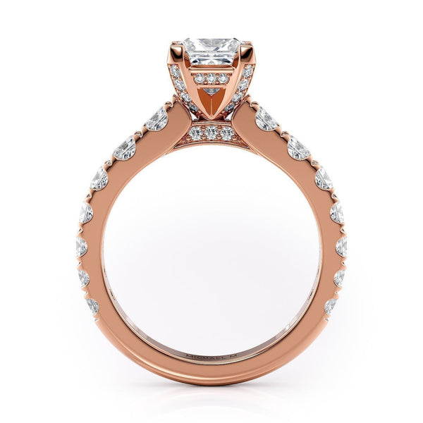 This MICHAEL M engagement ring is adorned with side diamonds handpicked by a certified MICHAEL M gemologist, each side stone has a minimum average color of G, a minimum average clarity of VS, and are hand-placed in an elegant prong setting by one of MICHAEL M’s master artisans.