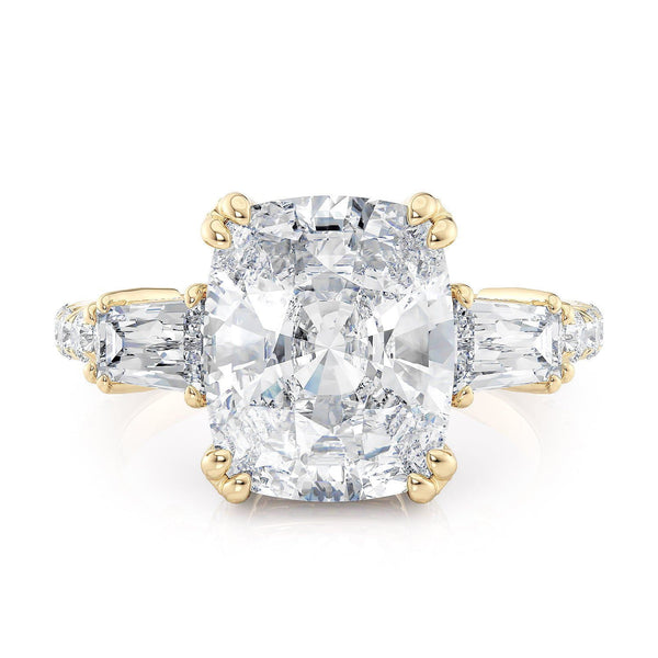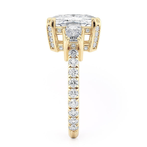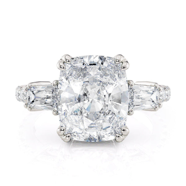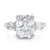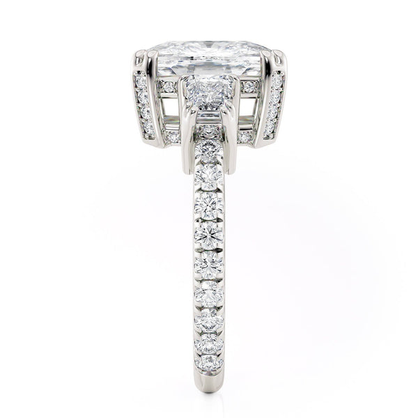 Discover the timeless sophistication of the Trinity R768-4 ring, showcasing a 4 carat center stone with two substantial diamonds on each side and a diamond band. This ring boasts abundant diamonds, radiating brilliance from every angle.