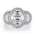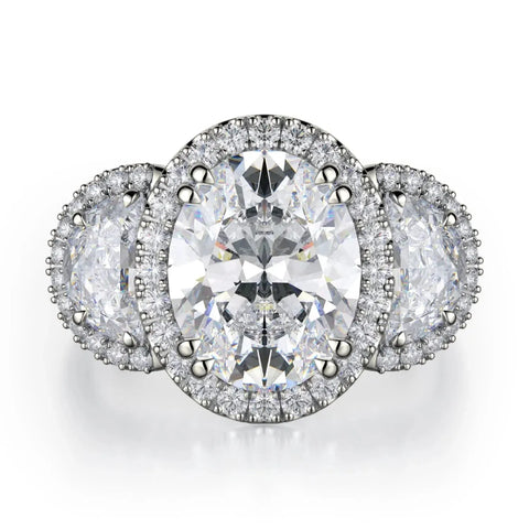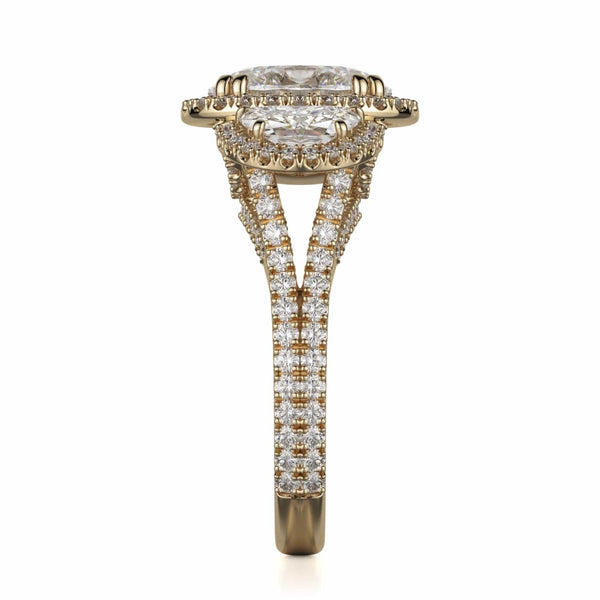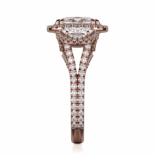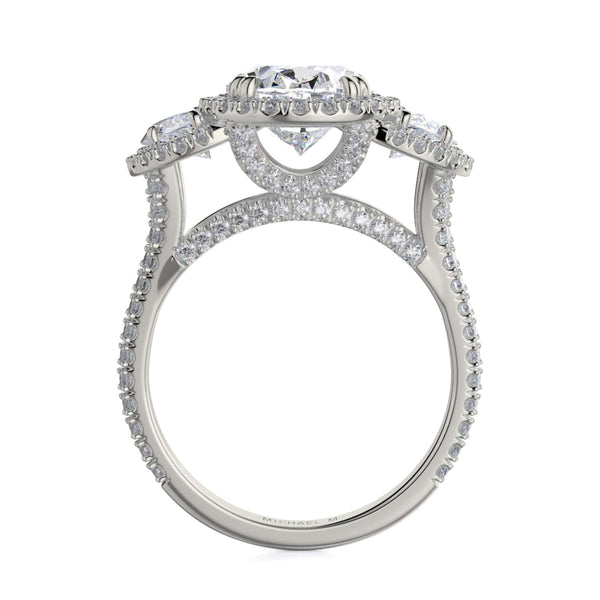 The Trinity R776-4 boasts a 4 carat center stone and two accompanying diamonds, all adorned with a dazzling halo. The shank is also embellished with diamonds, further enhancing the ring's radiant brilliance.