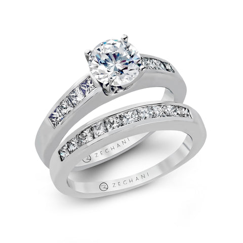 This bridal set features a round center stone engagement ring with Princess-cut diamonds channel-set along the band, paired with a matching diamond wedding band. The clean lines and radiant sparkle create a timeless and elegant combination.