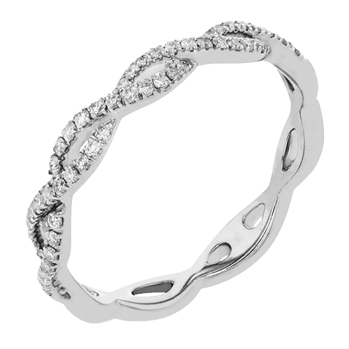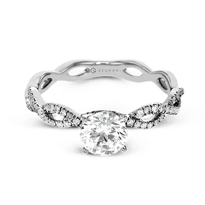 This bridal set features a graceful twist design with intertwined rows of pavé-set diamonds, framing a brilliant round center stone. The matching band mirrors the elegant curves for a romantic and cohesive look.