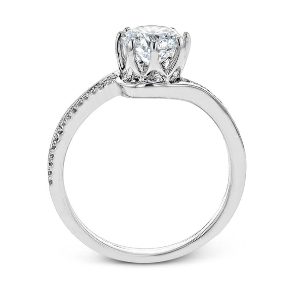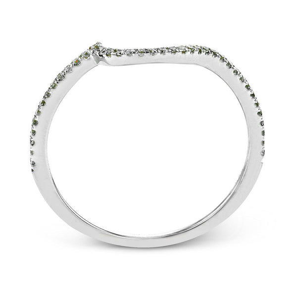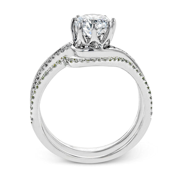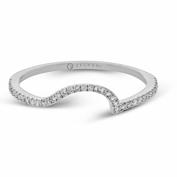 This sophisticated wedding set features a modern curved design with diamonds elegantly positioned along both sides of the band.