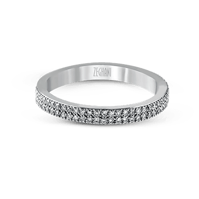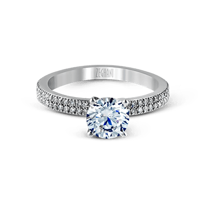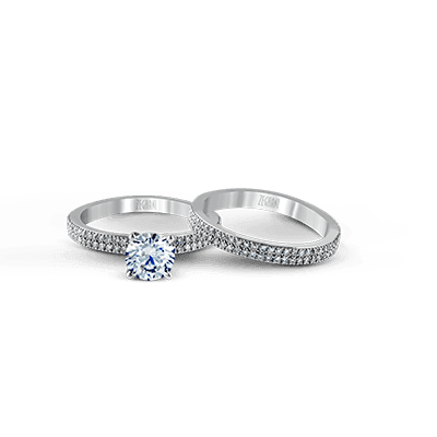 This dazzling bridal set features a classic round-cut center stone complemented by matching pavé diamond bands for a cohesive, radiant look. The double-band design enhances brilliance and offers timeless elegance with a modern edge.